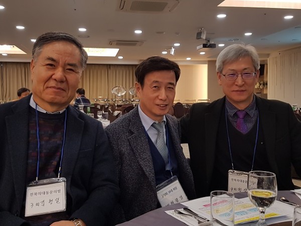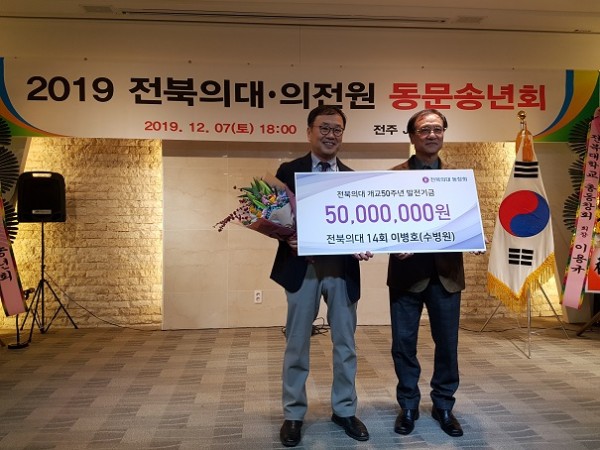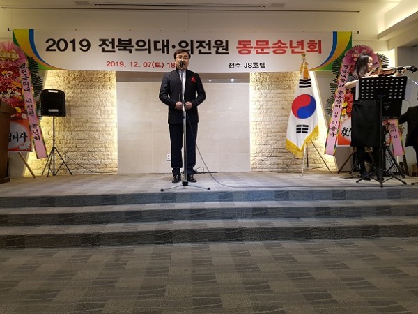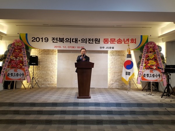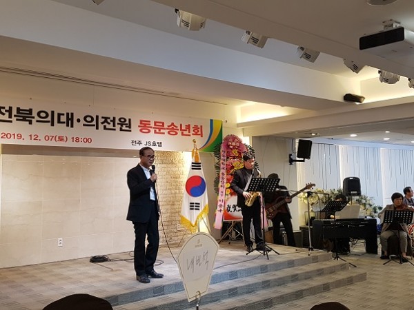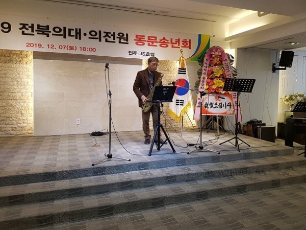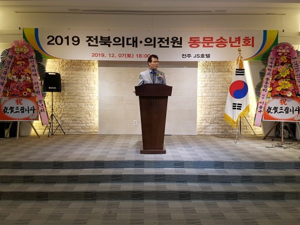 (행사후기 및 사진모음) □ 일 시: 2019. 12. 7(토) 오후 6시~등록/본행사 6시 30분 □ 장 소: 전주 제이에스 호텔 ▷▷▷▷▷▷ 1부 1. 국민의례 2. 개회사 3. 내빈소개 및 축사 4. 시상 및 감사패 수여 5. 강 연 연자: 조병춘 동문(조병춘안과의원 원장) 연제: '빚진 자의 감사' * '2019자랑스러운 동문대상' - 조병춘(동문4회/17대-18대-19대 회장역임) 상금으로 주어진 1백만원은 동창회발전기금으로 기부함. 6. 개교50주년발전기금 기탁식 14회 이병호 동문 5천만원 기부 ▷▷▷▷▷▷ 2부 7. 성악: 강경범 동문(18회) - 눈 / DEIN IS MEINGANZES HERZ 8. 문무창 동문(2회)의 색소폰 연주 9. 길스밴드공연: 길상선(5회), 박영규(8회), 이형구 동문(6회) 외 3명 - 그 겨울의 찻집 / O Sole Mio 10. 노래뜸(재학생) 하현수 민지홍 장현준 - Supermarket Flower(애드시런) 김연수 이지원 박찬혁 김수현 - 캔디(HOT) ▷▷▷▷▷▷ 3부 11. 최다참석동기회상 시상 12. 행운권 추첨 ▷▷▷▷▷▷ 4부 /공지 및 폐회 최다참석동기회상 1등- 13회동기회/ 2등 - 8회 동기회 13. 동창회 공지 -개교50주년행사에 관한사항 -동창회발전에 관한 사항 14. 폐 회 전북대학교 의과대학 • 의학전문대학원 동창회 www.cbmed.or.kr [이 게시물은 동문지기님에 의해 2019-12-11 10:57:59 공지사항에서 복사 됨] |