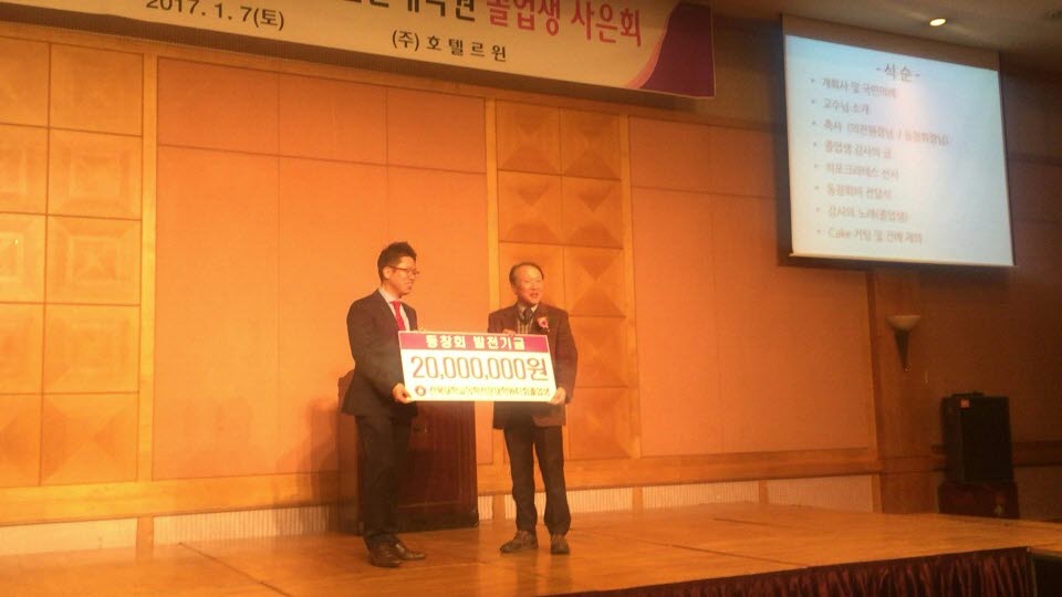 41회 졸업생 사은회에서 동창회발전기금으로 2천만원을 기부하였다. 동창회 도병용 회장(20대) |