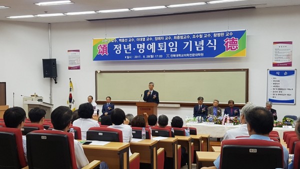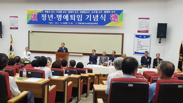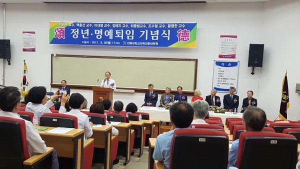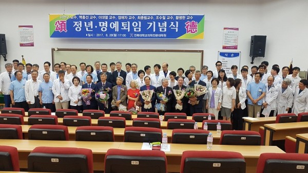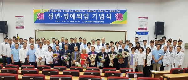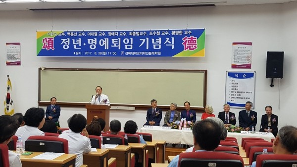 -일시: 2017. 8.28(월) 오후5시 -장소: 전북대학교 의학전문대학원 본관 1층 합동강의실 -명예.퇴임교수 이헌구, 백홍선, 이대열, 정애자, 최종범, 조수철, 황평한 교수 -식 순- 1. 개식 2. 국민의례 3. 원장인사 4. 내빈축사(동창회 이수택 부회장) 5. 정년 및 명예퇴임교수 약력소개 6. 공로패 증정 7. 정년 및 명예퇴임교수 퇴임사 8. 폐식 |