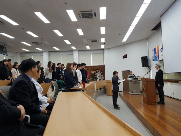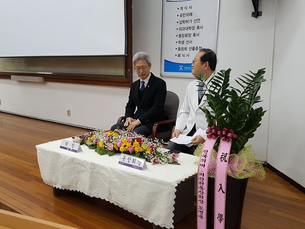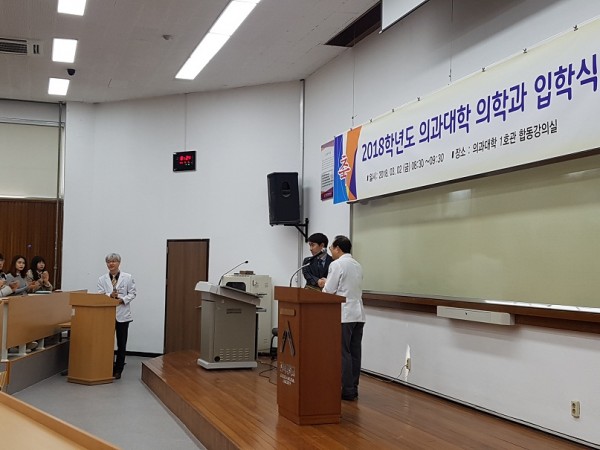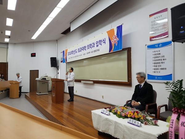 지난 3월 2일(금) 오전 8시 10분, 의과대학 대강당에서 1학년 신입생과 학부모가 모인 가운데 2018학년도 입학식이 있었다. 이 자리에 정상근 학장을 비롯, 의과대학 교수와 동창회 이수택 부회장이 참석, 축하했다.
