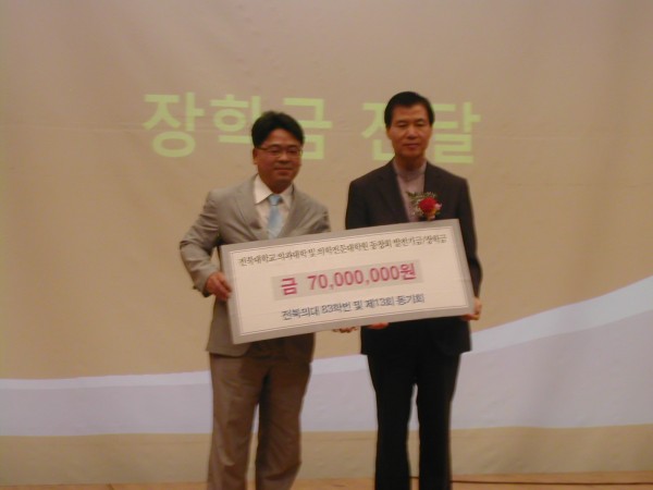 이 자리에 은사님과 의학전문대학원 김기원 원장, 김영곤 대학병원장, 조병춘 동창회장이 내빈으로 참석하여 학교의 발전모습을 소개하고 기념축사와 은사님의 덕담으로 만남의 기쁨을 함께 나눴다. 본 행사에 앞서 모교를 방문하여 학교를 돌아 본 후, 모교 정원에 기념식수를 하였고 행사장에서는 7천만원의 발전기금(장학금)을 동창회에 전달하였다. 다음으로 축하케잌 커팅과 건배제의를 하였고 추억의 동영상을 관람하며 식사를 마친후 2부 '화합 한마당'으로 향했다. -사무국 [이 게시물은 동문지기님에 의해 2009-06-02 14:23:36 공지사항에서 복사 됨] |