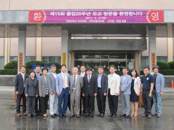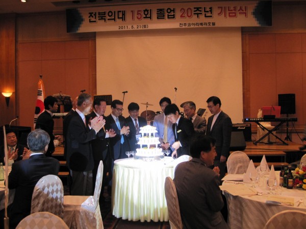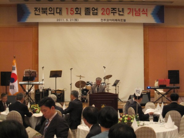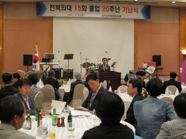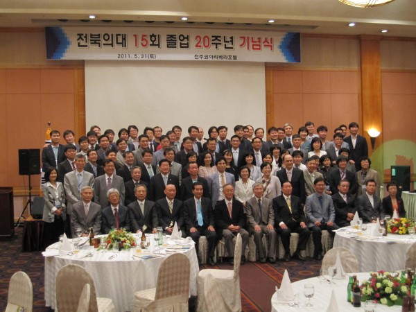 15회 졸업 동기들이 지난 5월 21 일,한 자리에 모였다. 리베라 호텔에서 열린 20주년 기면 행사에서 90여명의 동기생들이 오랜만에 만나 반가움과 정다움으로 서로 얼싸안고 함께 노래를 부르면 그 동안 못 나누었던 정을 한껏 나누었다. 회장 최 철 동문과 총무 김일호 동문, 재무 임석태 동문을 포함하여 많은 동기생들이 준비를 정성껏 한 덕에 그 동안의 정을 나누기에 아주 풍족한 자리가 되었다. 전국에 뿔뿔이 흩어져 있던 주소록을 정비하여 당일에 배포되었으며 대학시절 찍은 사진 상영, 동기생들의 영상편지가 줄을 이어 무대의 화면을 채웠다. 약 30여분의 스승님들도 참석하여 20주년을 축하해 주셨으며 기념촬영도 이루어졌다. 또한 학창시절 한참 주가가 높았던 예능 동기생들의 공연도 있었는데 조성진 동문의 감미로운 노래, 이덕수 동문의 통기타연주, 천기태 동문의 색소폰 연주, 정우석 동문의 트럼펫 연주 등이 있었다. 의대 엘도라도 밴드 출신들이 주축이 되어 이루어진 닥터스 밴드의 축하공연이 있었는데 이 밴드에는 15기 중에 최 철 동문과 천기태 동문이 멤버로 활동하고 있다. 최 철동문은 인사말에서 오랜만에 만난 동기들에게 반가움과 참석해 준 데에 대한 고마움을 전했으며 조 병춘 동문회장님은 축사에서 15회 동문들의 단결된 모습과 활동에 대해 치하하고 격려하였다. 한편 15회 동기회에서는 모교에 원의 발전기금을 전달하여 보는 이들로 하여금 더욱 흐뭇하게 하였다. 이어 2차로 이어진 술자리에서 밤이 새도록 이야기를 나누고 또 나누었다. 다음 날 군산 컨트리 클럽에서 스승님들과 팀을 나누어 골프대회를 치루어 사제간에 정을 더욱 돈돈히 하는 자리가 되었다. 15회 동기회는 앞으로 매년 골프대회나 송년회 등을 통해 자주로 만나기로 하고 아쉬움을 하고 헤어졌다.