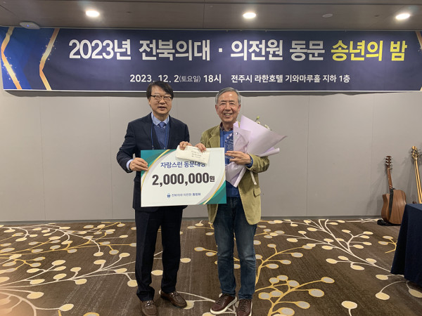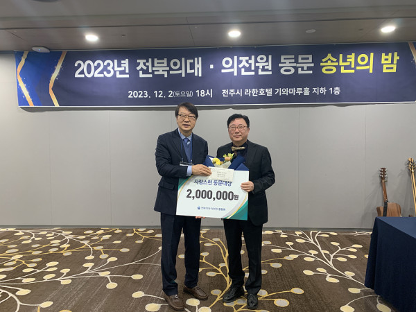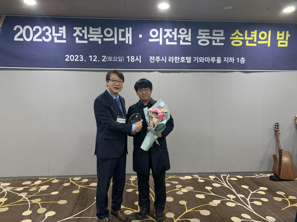 2023년 12월 2일(토) 오후 6시에 전주 라한호텔에서 2023년 전북의대·의전원 동문 송년의 밤 행사가 개최되었다. 오영민 사무총장(동문 26회)의 사회로 진행된 행사에서 박천수 회장님(동문 8회)의 개회사 및 내빈소개, 전북대병원 유희철 병원장(동문 12회)의 축사, 자랑스러운 동문대상 강연 및 시상, 의과대학 임석태 학장(동문 15회)의 의과대학 주요 현황 보고, 27회 졸업20주년 기념행사 준비위원장 감사패 증정 순서로 1부 행사가 있었다. 2023년 자랑스러운 동문 대상은 김주형 원장(동문 7회)이 수상하였고 ‘아름다운 가게와 함께한 18년’이라는 주제로 강연을 하였고, 2021년 수상자인 주찬웅 교수(동문 3회)도 그 당시에 시상식을 하지 못하여 이번에 수상 및 강연을 하였다