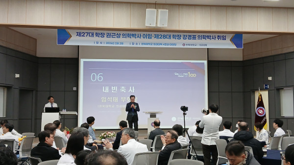 이번 행사에는 양종철 병원장과 정연준 의과대학 교수회 회장을 비롯한 많은 교직원이 참석하여 자리를 빛냈다. 제27대 권근상 학장은 이임사를 통해 지난 의정 갈등이라는 어려운 시기 동안 대학 운영에 헌신적으로 협조해 준 교수진과 교직원들에게 깊은 감사를 표했다. 특히 권근상 학장은 새롭게 출범하는 제28대 집행부가 복귀한 학생들이 차질 없이 학업에 전념할 수 있도록 세심한 지원과 노력을 기울여 줄 것을 당부했다. 제28대 학장으로 취임한 강경표 교수는 "급변하는 환경 속에서도 학생들의 학업을 최우선 가치로 삼고 학생들이 안정적인 환경에서 양질의 교육을 받을 수 있도록 노력하겠다."고 포부를 밝혔다. 출처:전북대학교의과대학 소식지 [이 게시물은 동문지기님에 의해 2026-04-03 10:30:38 공지사항에서 복사 됨] |