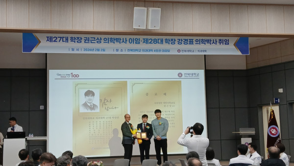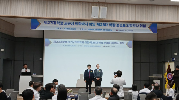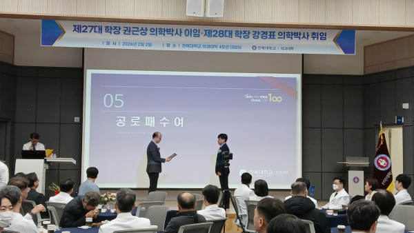 2026.2.2.(월) 12:00 의과대학 4호관 대강당에서 전북대 의대 제27대·제28대 의과대학장 이·취임식 거행되었다.